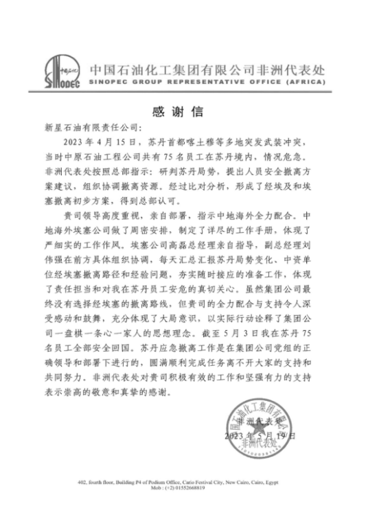 近日,新星公司收到中國石化集團非洲代表處的感謝信,感謝新星所屬中地海外埃塞公司在中國石化集團中原石油工程公司駐蘇丹工作人員撤離過程中給予的全力配合和支持,對參與協(xié)助撤僑工作的同志給予了充分認可和高度贊揚。