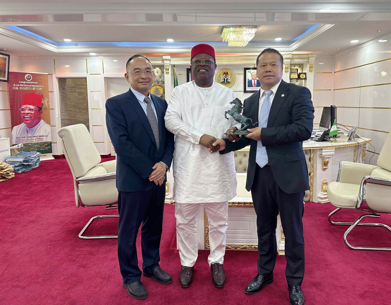 9月27日上午,蘭眉中一行拜會(huì)中國(guó)駐尼日利亞大使于敦海、公使銜經(jīng)濟(jì)商務(wù)參贊王穎琦,重點(diǎn)匯報(bào)公司在尼生產(chǎn)經(jīng)營(yíng)情況和重點(diǎn)項(xiàng)目進(jìn)展,感謝駐尼使館長(zhǎng)期以來對(duì)公司發(fā)展給予的大力支持,表示將在使館領(lǐng)導(dǎo)下,不斷提升經(jīng)營(yíng)質(zhì)量,積極參與“中非攜手推進(jìn)現(xiàn)代化十大伙伴行動(dòng)”落實(shí),做好“非洲發(fā)展的伙伴,中非合作的橋梁”,推動(dòng)中尼務(wù)實(shí)合作再上新臺(tái)階。于敦海大使對(duì)中地海外在尼取得的成就給予高度贊賞,表示將繼續(xù)支持公司在尼發(fā)展,希望公司在推進(jìn)高質(zhì)量發(fā)展的同時(shí),講好中國(guó)故事,打造企業(yè)優(yōu)質(zhì)形象。